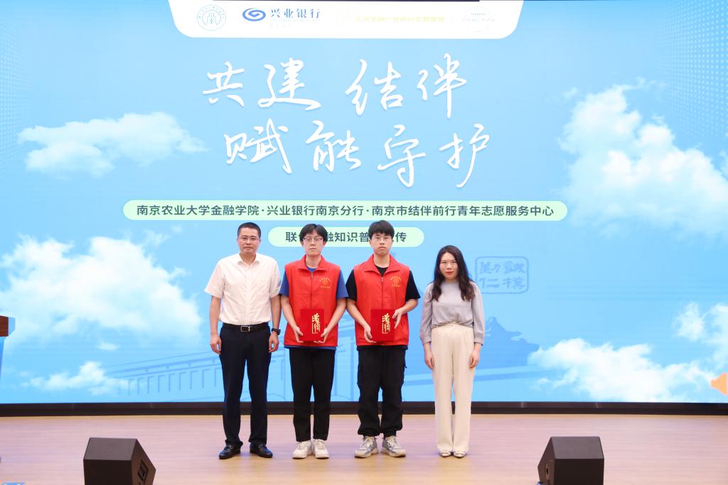 活动现场,朱珠、徐迎为“南京农业大学就业创业实习基地”揭牌,郑倩为“金融公益宣教联合青年先锋队”授旗,郑倩、沃野为“校园金融消保宣传青年大使”授牌。